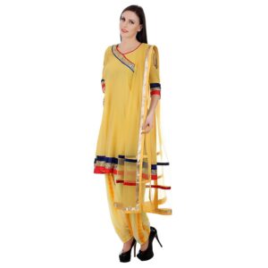 Yellow Chanderi Short Anarkali-Peacock embroidery on the sleeves for Ladies.
