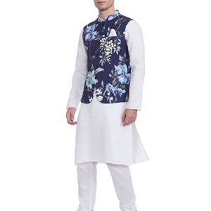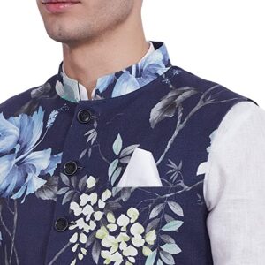 Look your ethnic best wearing this navy colored bundi from the house of Ethnix. The blend of 55% cotton and 45% linen fabric lends this bundi a subtle sheen and lightweight feel. Offering a great fit, this bundi will go well with a white colored kurta-churidar set.