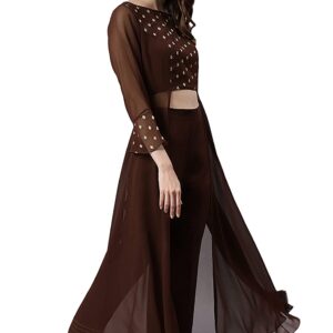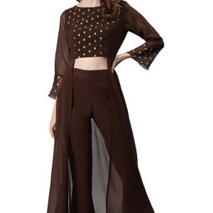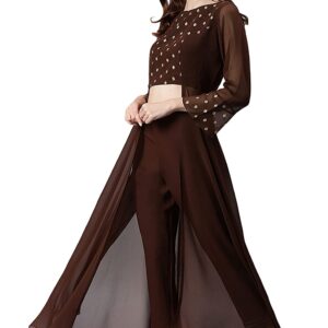 Flaunt your new look with this splendid brown top and pant by Janasya. It is crafted in georgette with layer of poly crepe beneath it. Highlighted by gold print this top has bell sleeves, round neck, and georgette flair. Completing the look it comes with poly crepe pants which has gota patti lace on hems. Pair it up with cute bow sandals.