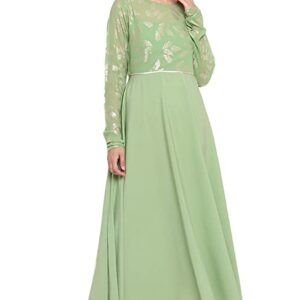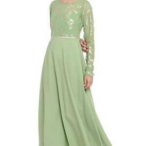 This attractive pista green fit and flared maxi kurta is all you need for your social gatherings. This maxi length kurta features gold piping at neck, gotta patti at empire line, gold foil leave motifs on georgette bodice, full sleeves and is a playful mix and match of fabrics. You can get all playful and fun while still carrying the ethnic glam look.