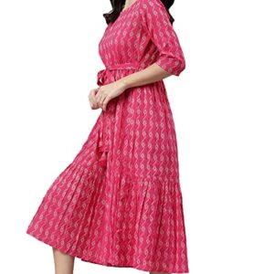 Glow and lightness of this enticing pink fit and flare dress, with pleats below waist, offers a comfy casual look which translates into an excellent two mile wear with bohemian styling. This calf length dress features layered pleats, 3/4 sleeves and round neck.