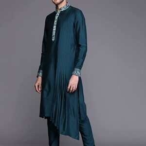 Home Mens Ethnic Manyavar Kurta Jacket Set for Men, Full Sleeves Mandarin Collar Ethnic Wear Jacket Set for Festival, Wedding, Party Blended Viscose (Blue)