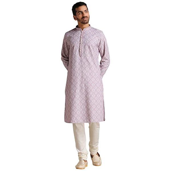 Home Mens Ethnic Manyavar Kurta Set for Men, Full Sleeves Mandarin Collar Ethnic Men’s Kurta Set for Engagement, Wedding, Party Blended Cotton Printed