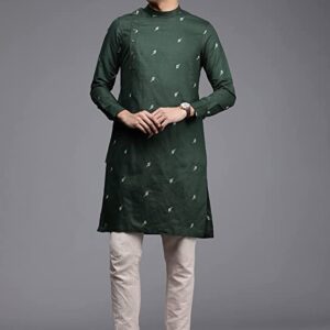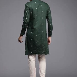 Home Mens Ethnic Manyavar Men’s Kurta, Full Sleeves Mandarin Collar Ethnic Knee-Length Kurta Only, Kurta for Festival, Wedding, Party, and Anniversary, Blended Linen (Green)