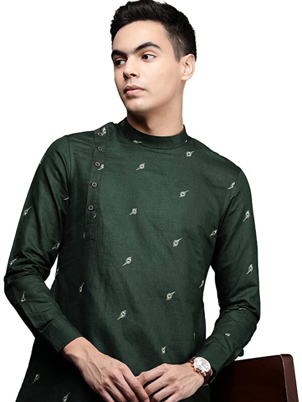 Home Mens Ethnic Manyavar Men’s Kurta, Full Sleeves Mandarin Collar Ethnic Knee-Length Kurta Only, Kurta for Festival, Wedding, Party, and Anniversary, Blended Linen (Green)