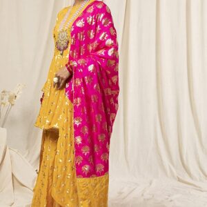Devaleena Creations Yellow Chanderi Short Anarkali-Peacock embroidery on the sleeves for Ladies