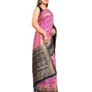 Pink color Party, With Woven With Combination of Meena Thread And Zari Butta All over, Has Zari woven border and pallu and Tussel Work at the end , Comes With Grey Color Contrast Unstiched Blouse (Included In sarees Length 5.40 Mtr+.80 Cm)