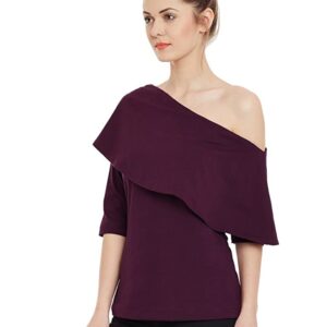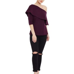 This knitted solid cotton layered one shoulder top, Has a round neck and 3/4 sleeves, Has Paneled detailing