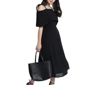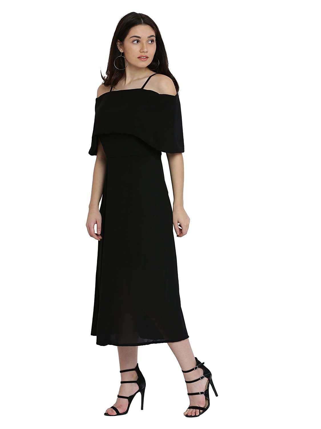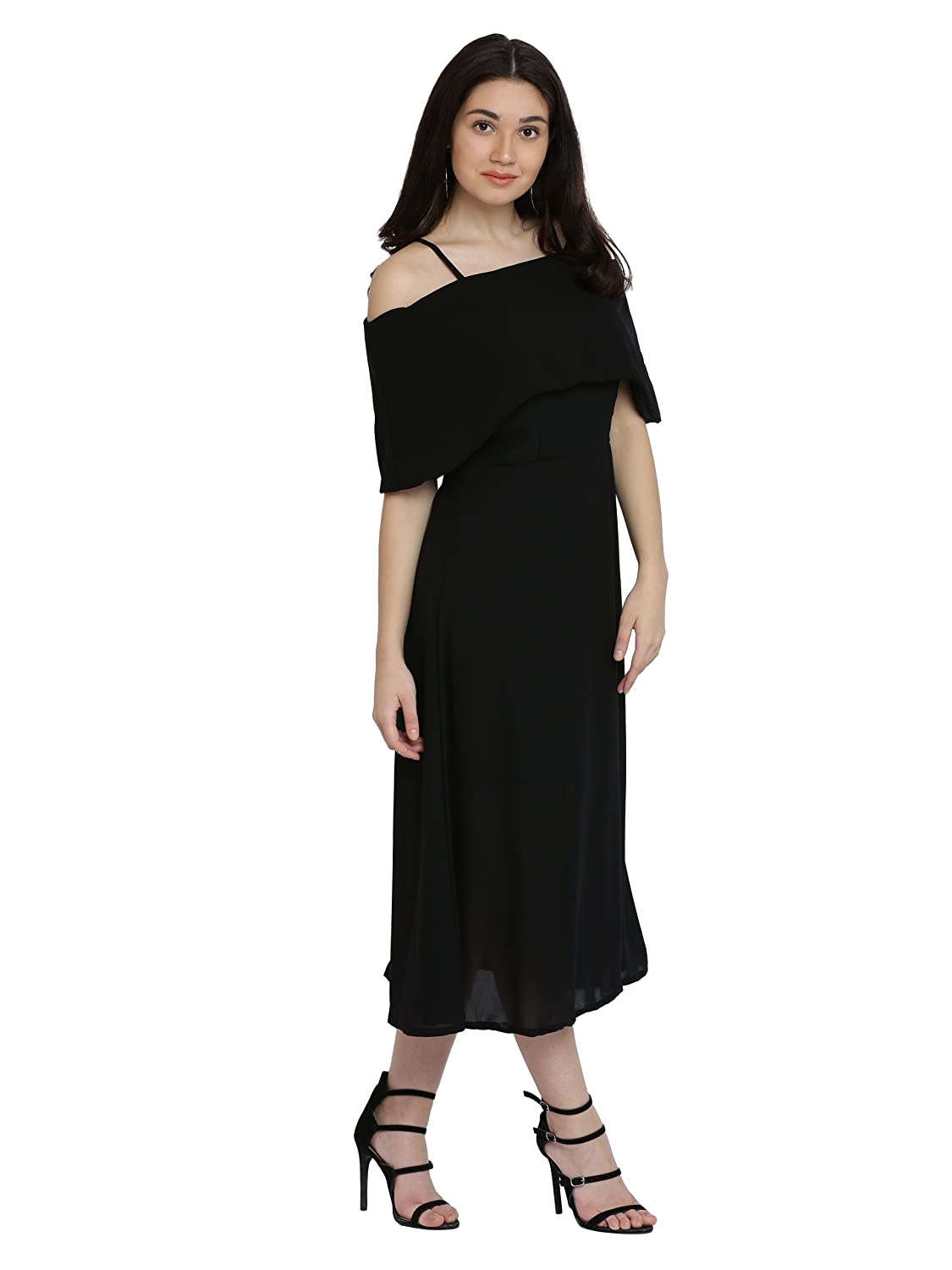 This solid Bardot style spaghetti strap midi skater dress, Has an off shoulder and is sleeveless, Has a zip closure