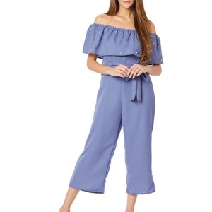 This solid pearl detailing belted midi Bardot style Off-shoulder jumpsuit, Is sleeves and has a zip closure