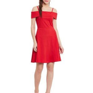This knitted cotton solid mini Bardot style mini skater dress, Is sleeveless and has an off shoulder, Has spaghetti strap detailing