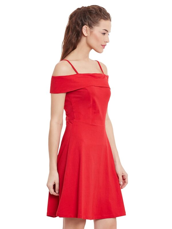 This knitted cotton solid mini Bardot style mini skater dress, Is sleeveless and has an off shoulder, Has spaghetti strap detailing