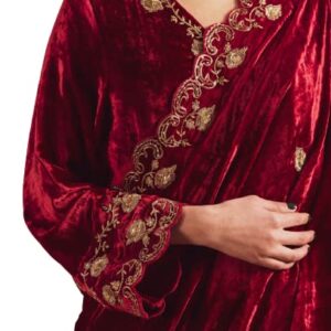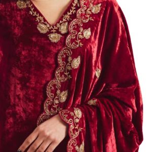 This is Neelu Sethi’s Designer Maroon suit . Its a kurta & salwar set . Kurta of this dress is of pure velvet fabric with relaxed fitting and full sleeves. It has a V- neck and shantoon lining , the kurti is knee length. It comes along with hand embroidery at the neck and sleeves .Topped with matching Velvet odhni . The dress is a set of 3 . Its a complete set , best suited for all weddings, family get togethers and festivals. Make your ceremonies, parties , festivals and all get togethers with your family more adorable with our ethnic yet so chic and stylish dresses.
