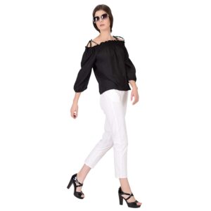 Top Style: Off shoulder tank top with scrunched neckline and 3/4th sleeved.