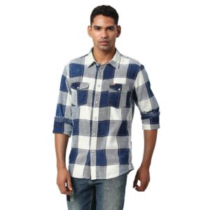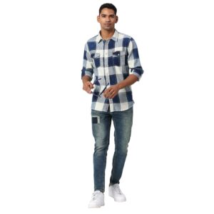 Yarn dyed indigo slub check shirt, regular fit, long sleeves with double pocket, denimax wash and branding details at pocket.