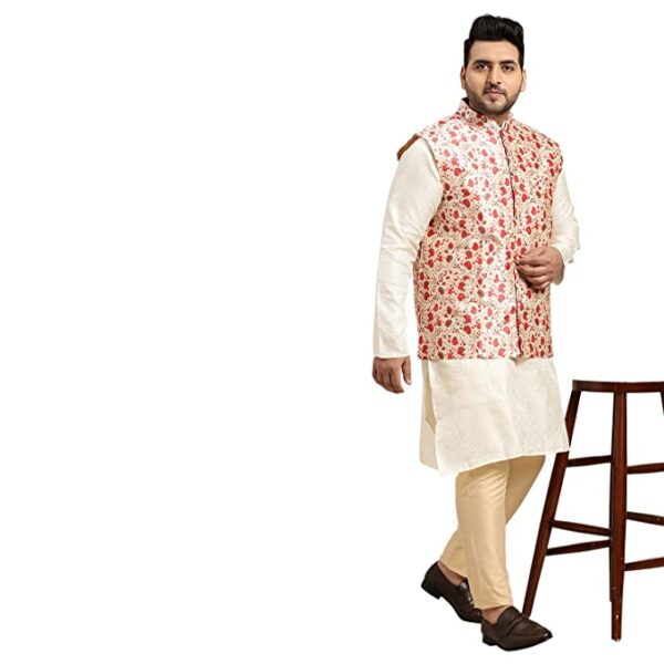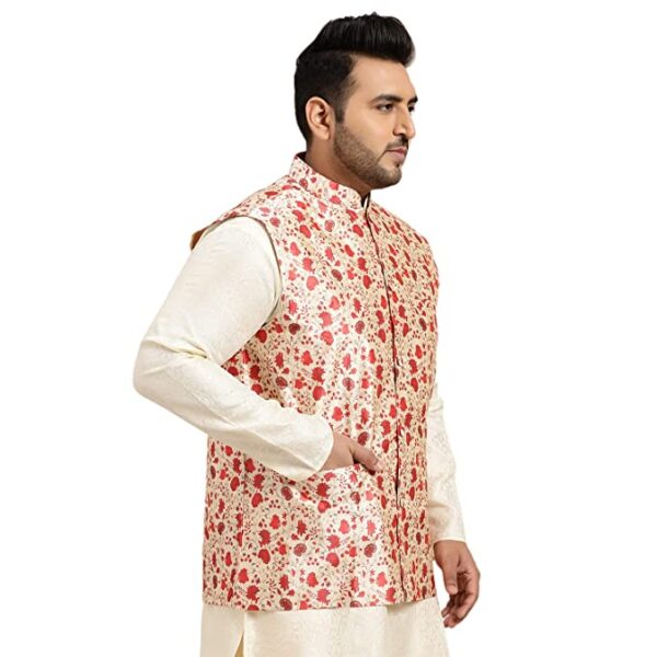 Sojanya PLUS as a brand brings you quality and affordability. In market since 1958, we take pride in our commitment to maintain quality standards in each piece manufactured by us. Look your ethnic best wearing this designer Blue & Steel color printed nehru jacket from the house of Sojanya PLUS. It is made up of premium silk blend fabric. Team this with kurta pyjama (preferably in contrast color) and look apart on special occasions.