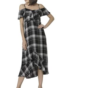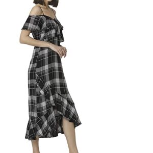 Casual yarn dyed check strappy midi dress. Fitted at the waist with flounce detail in the upper body and bottom panel.