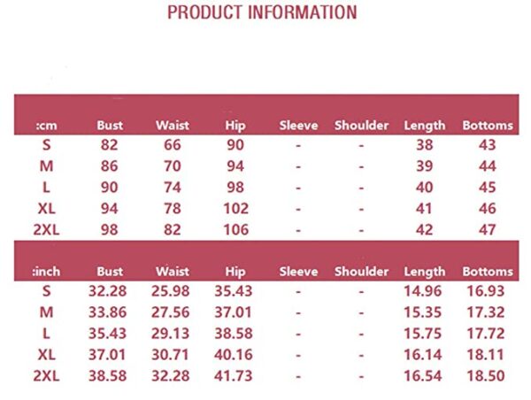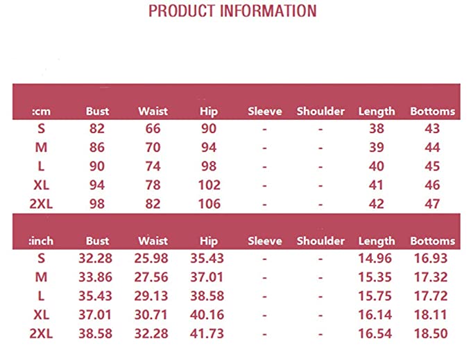 Tag L:–Bust:92cm/36.22″–Waist:74cm/29.13″–Hip:98cm/38.58″–Top Length:30cm/11.81″–Skirt Length:45cm/17.72″